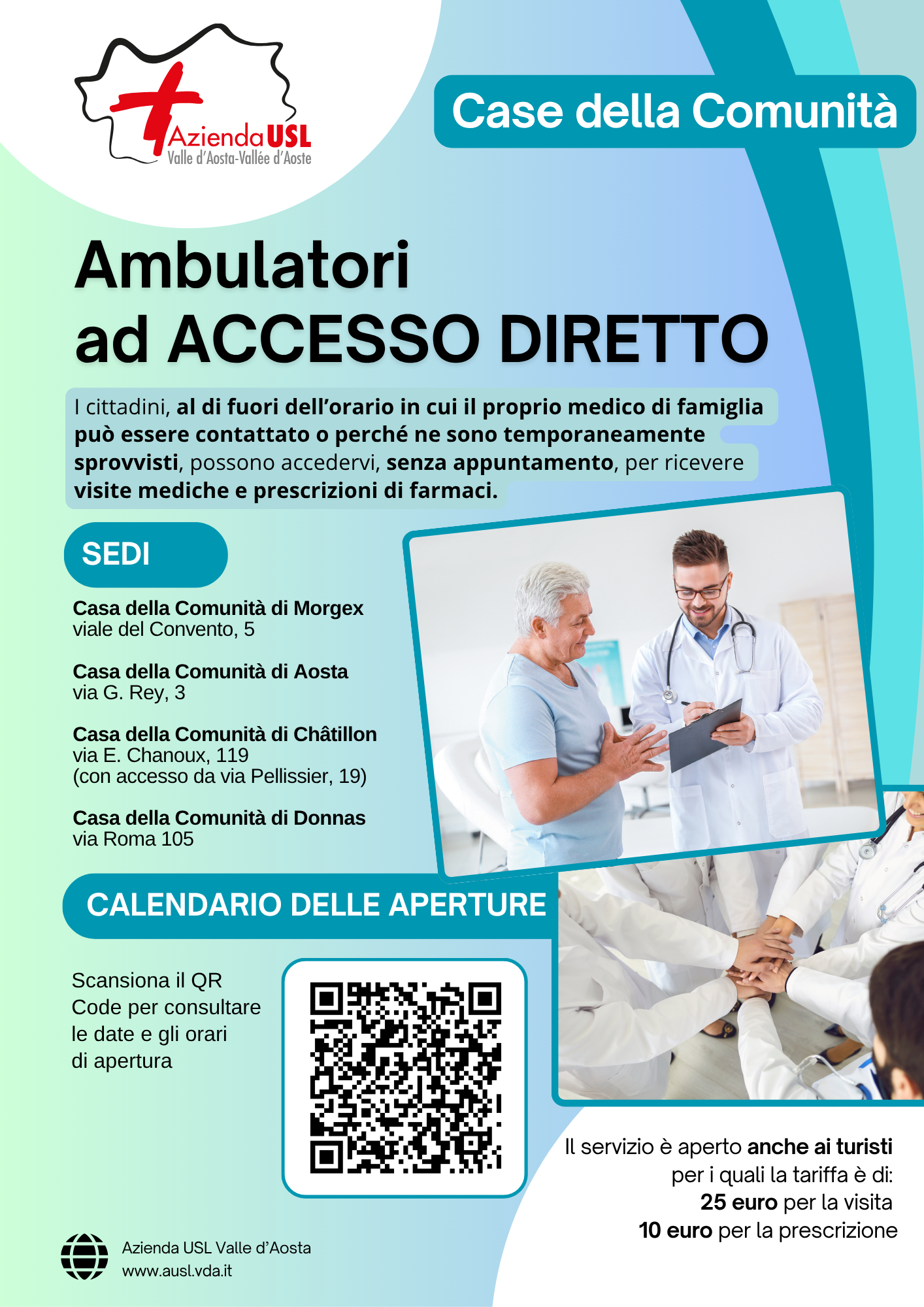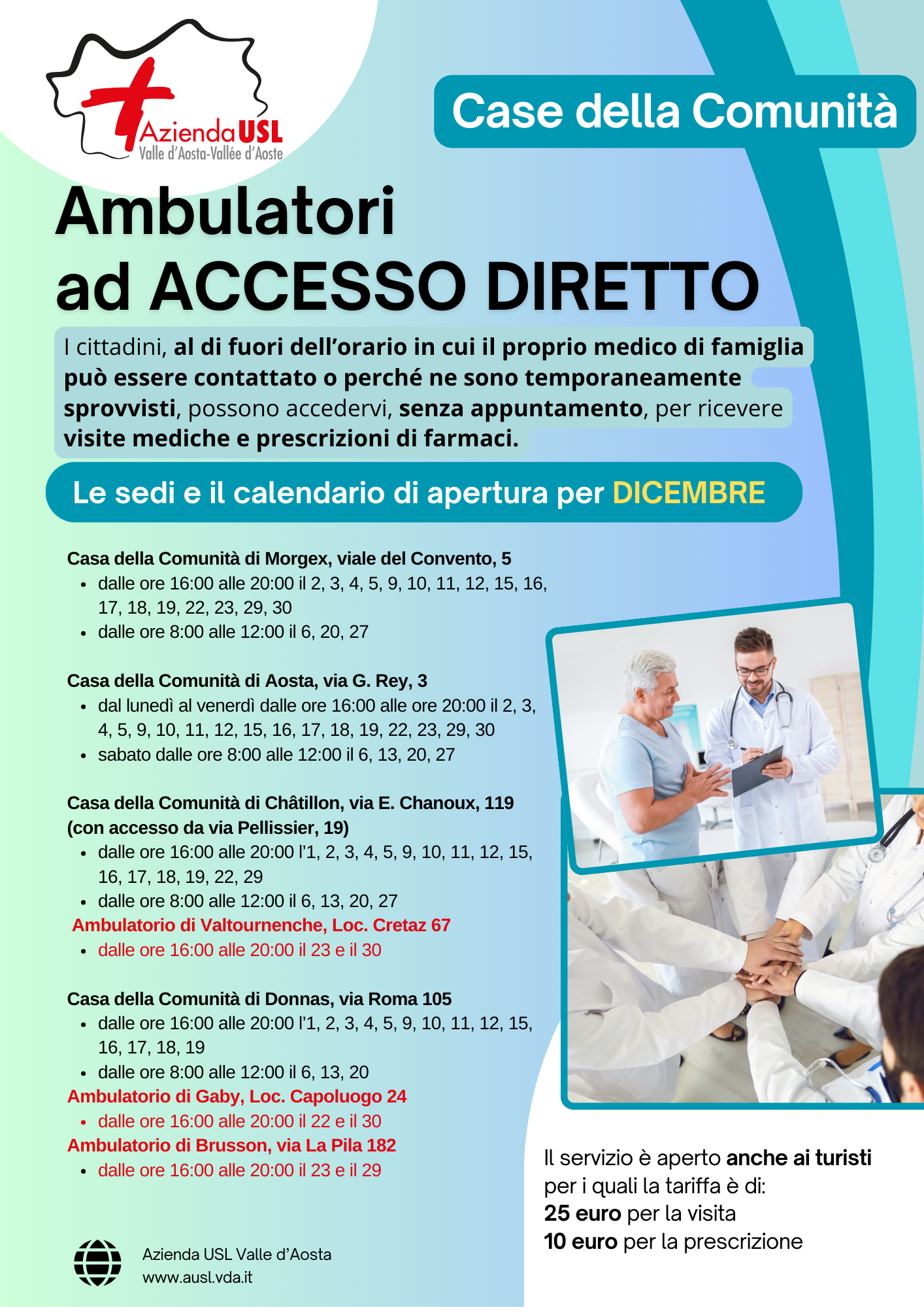 Sono operativi tutti gli Ambulatori ad accesso diretto presso le quattro Case della Comunità della regione (Morgex, Aosta, Châtillon e Donnas).